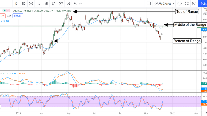 Nous attendons de voir un court-squeeze dans RH (NYSE : RH) depuis le dernier rapport sur les revenus et bas et au-delà il est enfin là. L'action est en hausse de plus de 9% sur un rapport de bénéfices solide, mais il y a une mise en garde pour les commerçants. Il y a clairement encore un certain sentiment baissier sur le marché, comme en témoigne l'action de la bougie. Si le marché ne peut pas surmonter cela, nous voyons l'action des prix baisser à nouveau avant de monter beaucoup plus haut. Marketbeat.com indique que cette action portait un intérêt à découvert de 12,5% en décembre, ce qui joue certainement un rôle dans la flambée des prix après la publication. Mis à part le sentiment baissier, les résultats sont bons et devraient soutenir la reprise à long terme des cours des actions. La question est bien sûr de savoir quand les ours lâcheront-ils le stock et laisseront-ils le rallye commencer ?